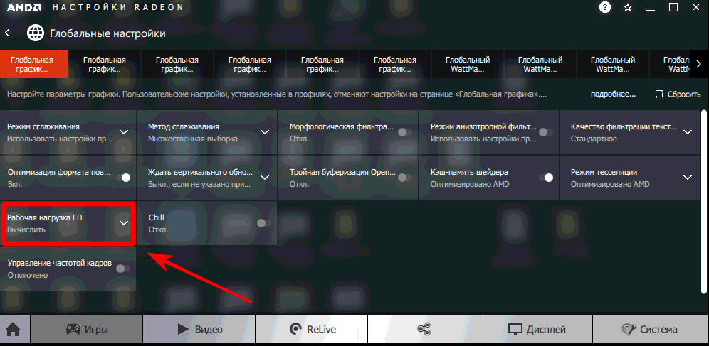 Игры – Глобальные настройки – Рабочая нагрузка ГП – Вычислить. Проделать эти настройки для каждой видеокарты в системе.