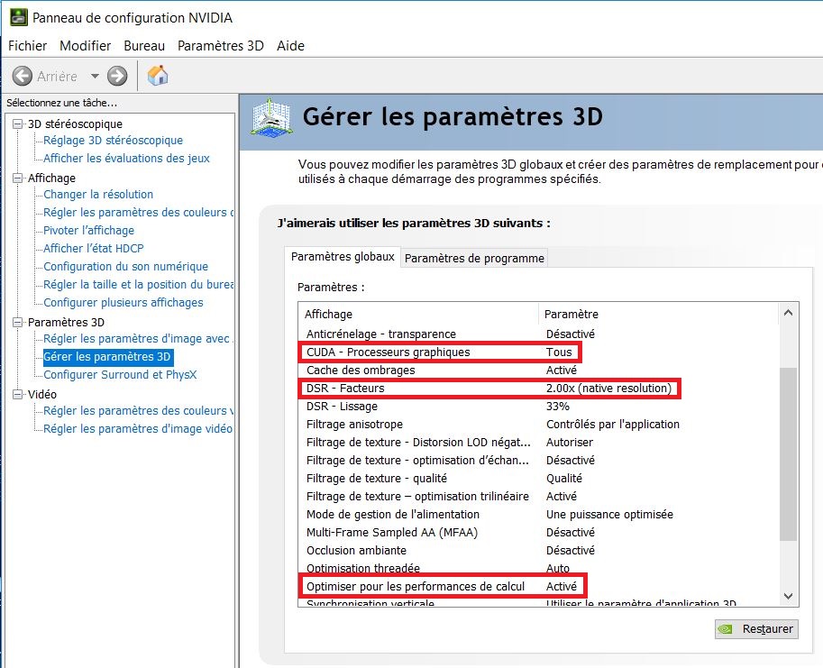 Установка последнего драйвера должна быть простой, но необходима некоторая насстройка. После установки драйвера перейдите в «Панель настройки Nvidia» (меню правой кнопки мыши на рабочем столе). Вы должны увидеть следующий экран (мой на французском языке, но я переведу для вас то, что нужно было настроить). Перейдите к настройке «3D Settings» => «Manage 3D» и:
