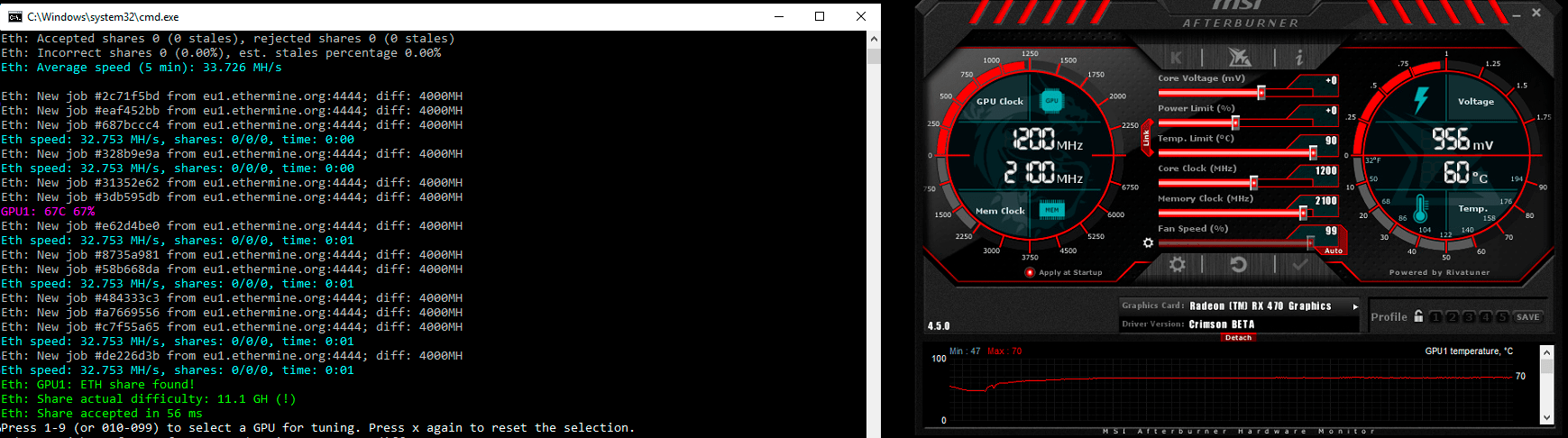 | Phoenix 4.2c | AMD RX470 4GB | 32.753 MH/s | 1200/2100 |